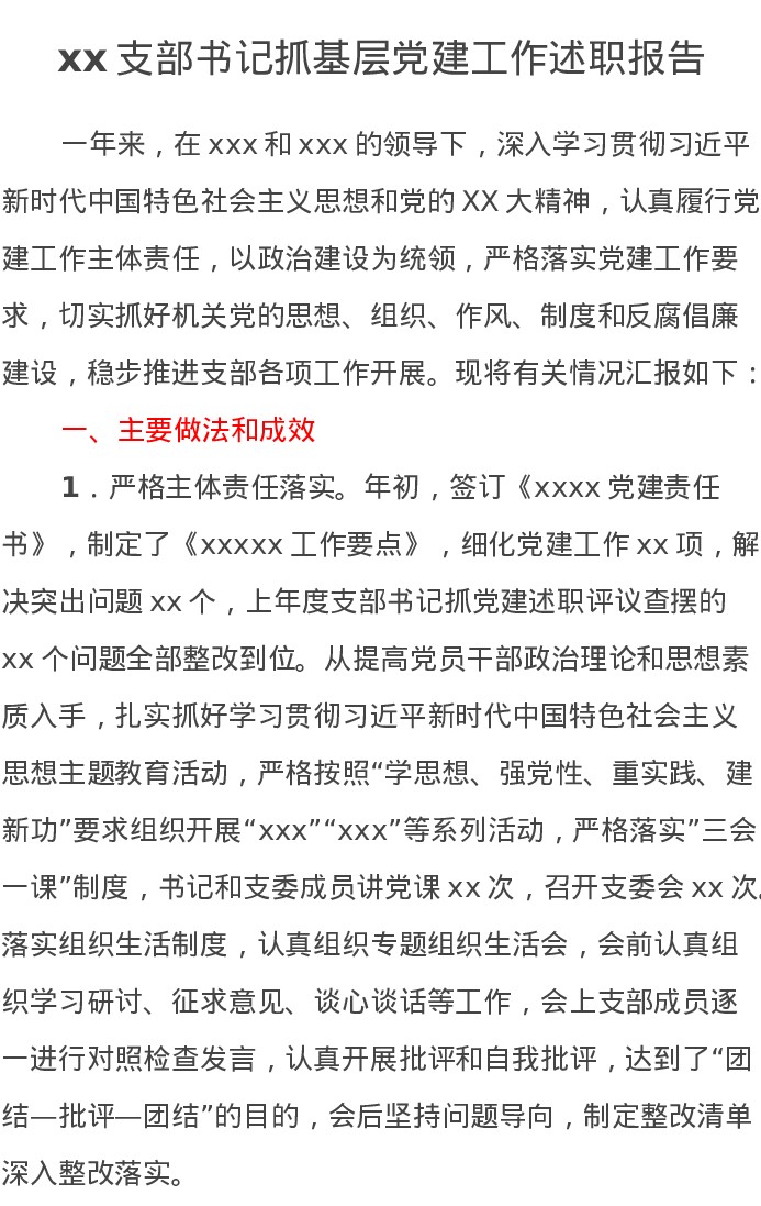 xx支部书记抓基层党建工作述职报告