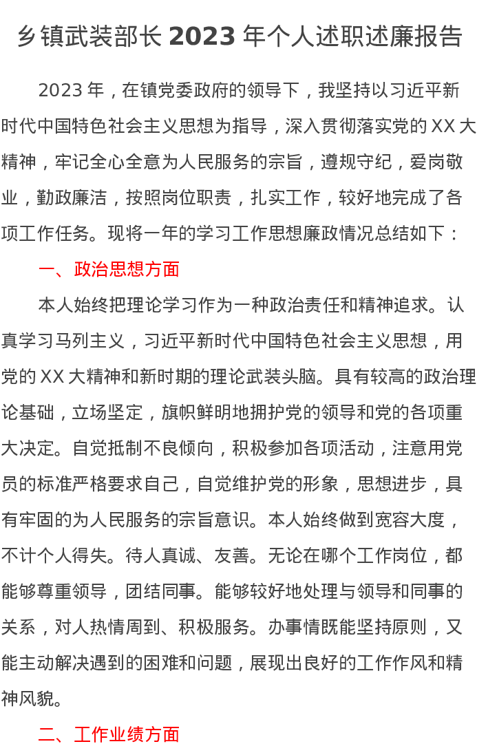 乡镇武装部长2023年个人述职述廉报告