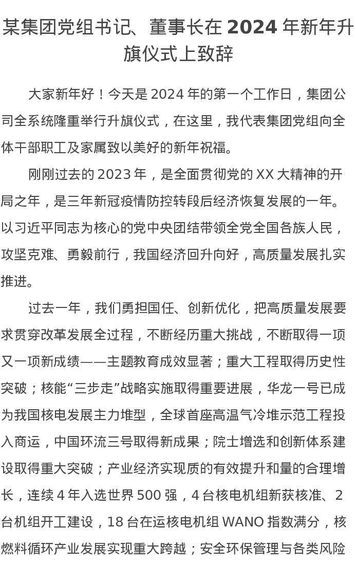 某集团党组书记、董事长在2024年新年升旗仪式上致辞