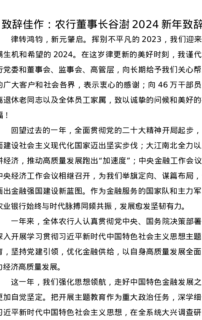 致辞佳作:农行董事长谷澍2024新年致辞