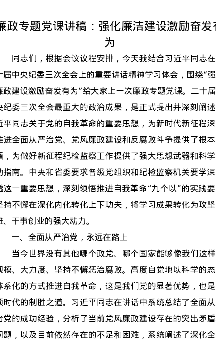 廉政专题党课讲稿:强化廉洁建设激励奋发有为
