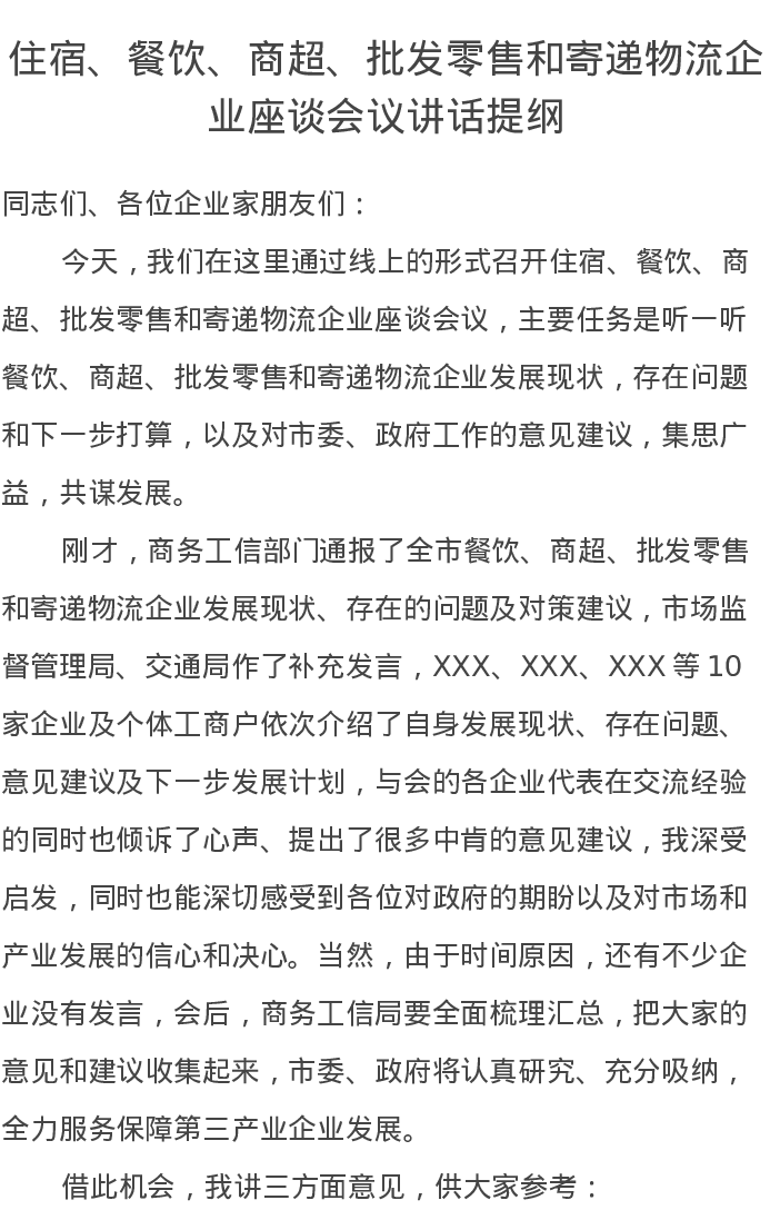 住宿、餐饮、商超、批发零售和寄递物流企业座谈会议讲话提纲