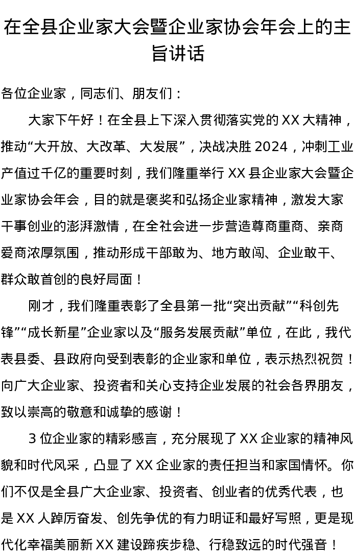 在全县企业家大会暨企业家协会年会上的主旨讲话
