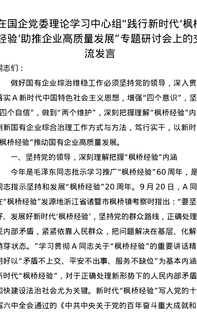 在国企党委理论学习中心组“践行新时代‘枫桥经验’助推企业高质量发展”专题研讨会上的交流发言