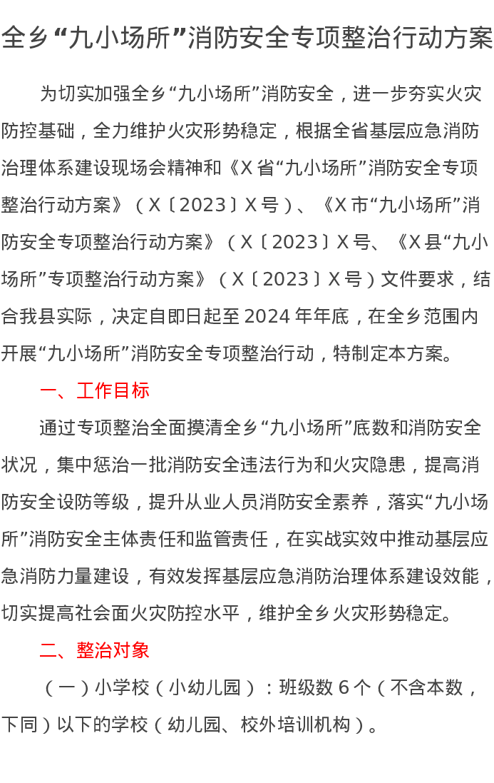 全乡“九小场所”消防安全专项整治行动方案