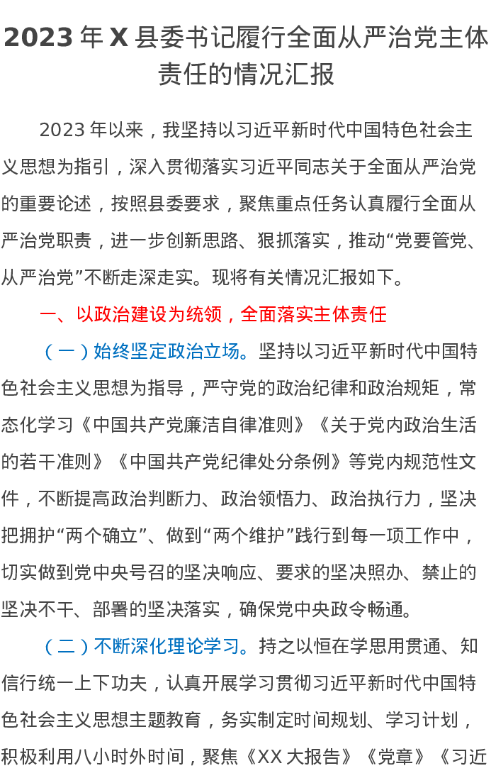 2023年X县委书记履行全面从严治党主体责任的情况汇报