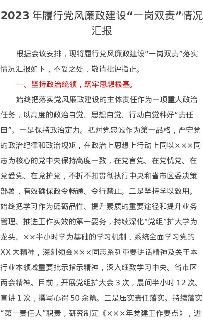 2023年履行党风廉政建设“一岗双责”情况汇报