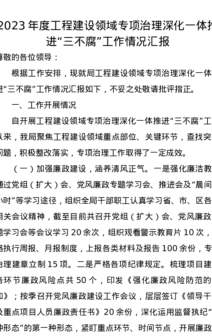 2023年度工程建设领域专项治理深化一体推进“三不腐”工作情况汇报