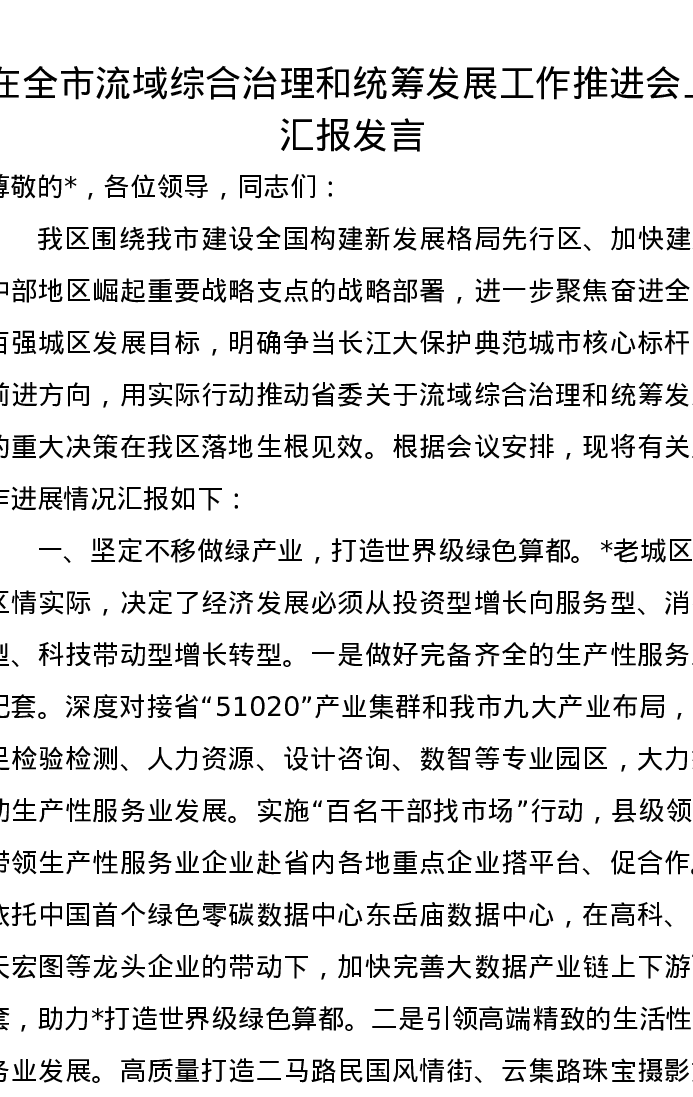 在全市流域综合治理和统筹发展工作推进会上汇报发言
