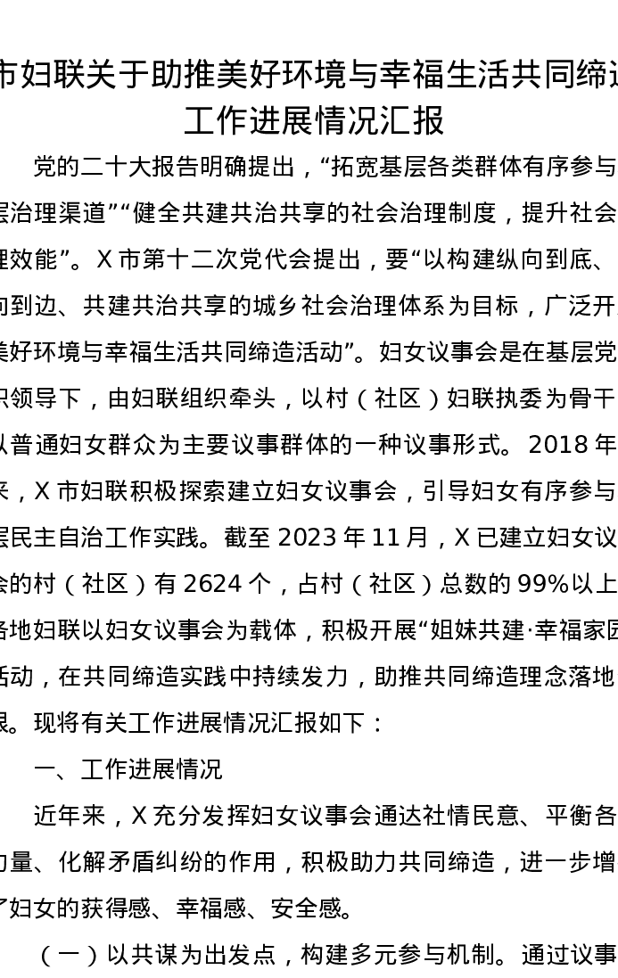 市妇联关于助推美好环境与幸福生活共同缔造工作进展情况汇报