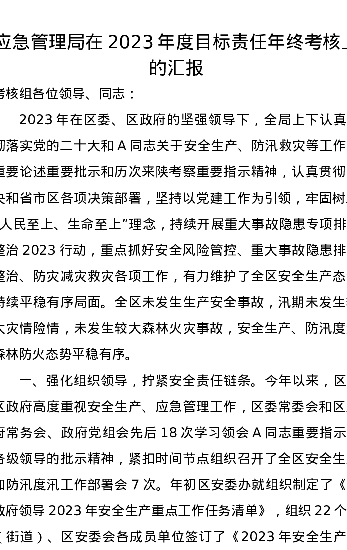 应急管理局在2023年度目标责任年终考核上的汇报
