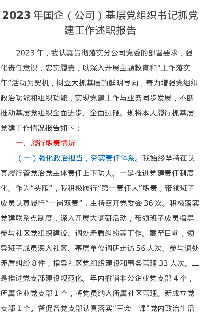 2023年国企(公司)基层党组织书记抓党建工作述职报告