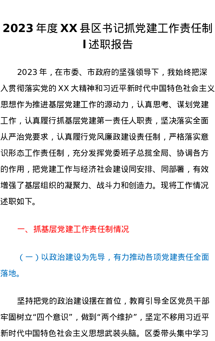 2023年度XX县区书记抓党建工作责任制l述职报告