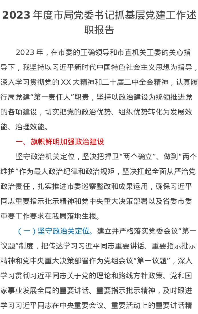 2023年度市局党委书记抓基层党建工作述职报告