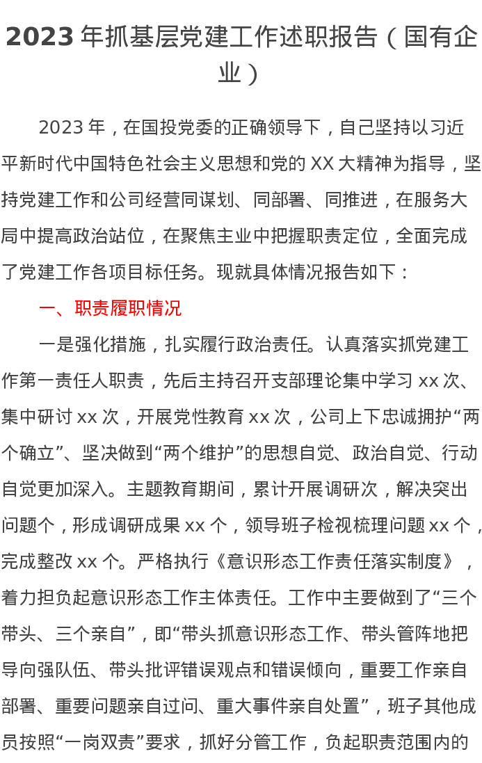 2023年抓基层党建工作述职报告(国有企业)