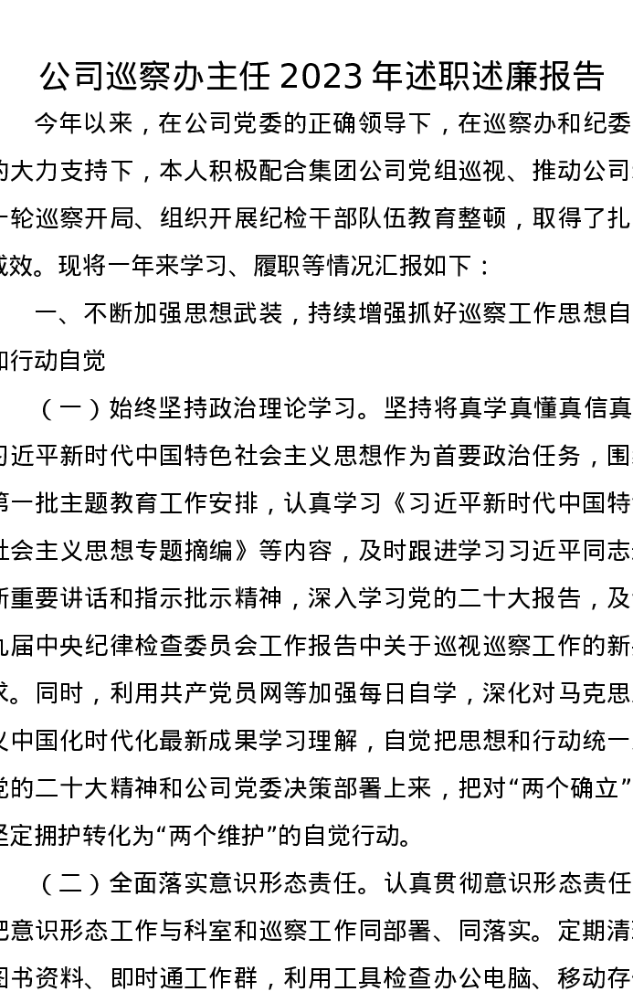 公司巡察办主任2023年述职述廉报告