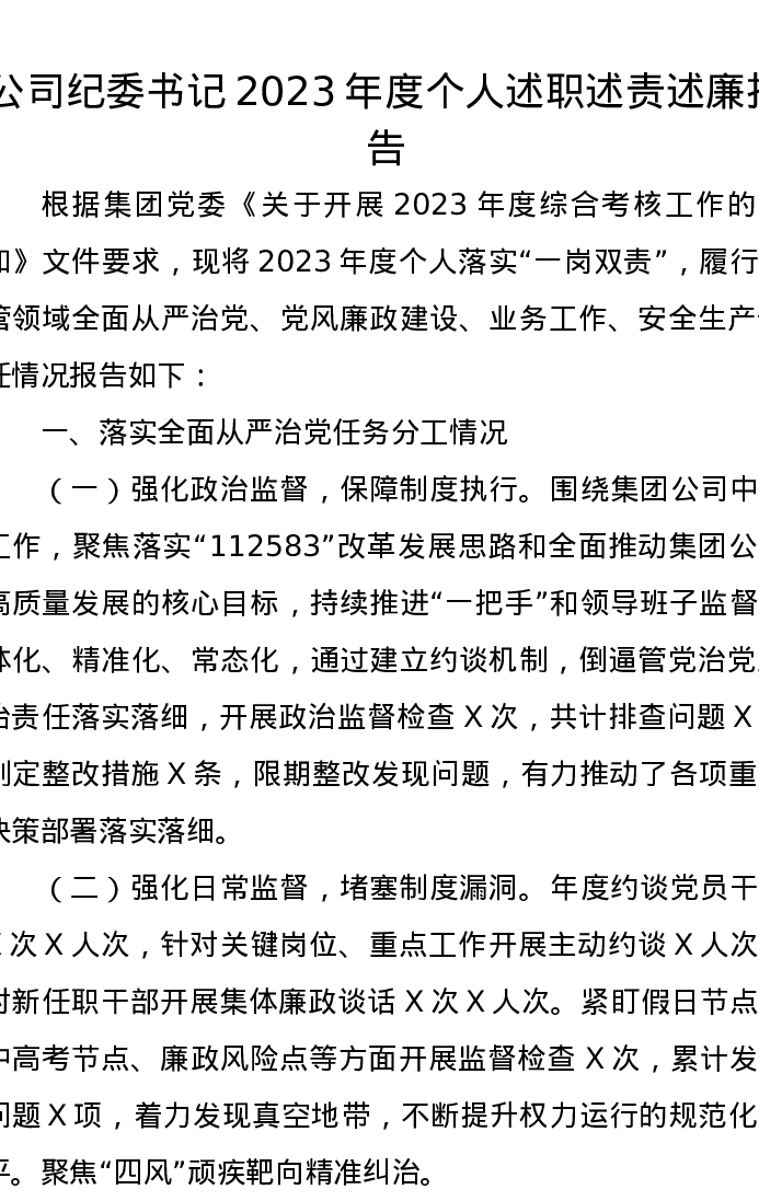 公司纪委书记2023年度个人述职述责述廉报告