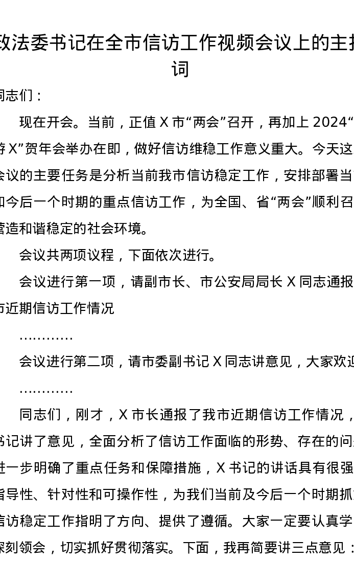 政法委书记在全市信访工作视频会议上的主持词