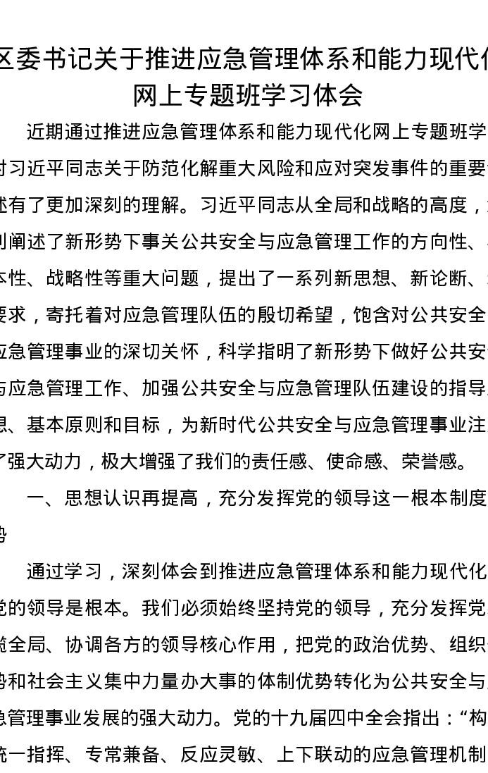 区委书记关于推进应急管理体系和能力现代化网上专题班学习心得体会