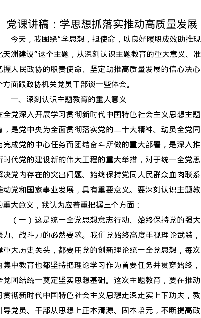党课讲稿:学思想抓落实推动高质量发展