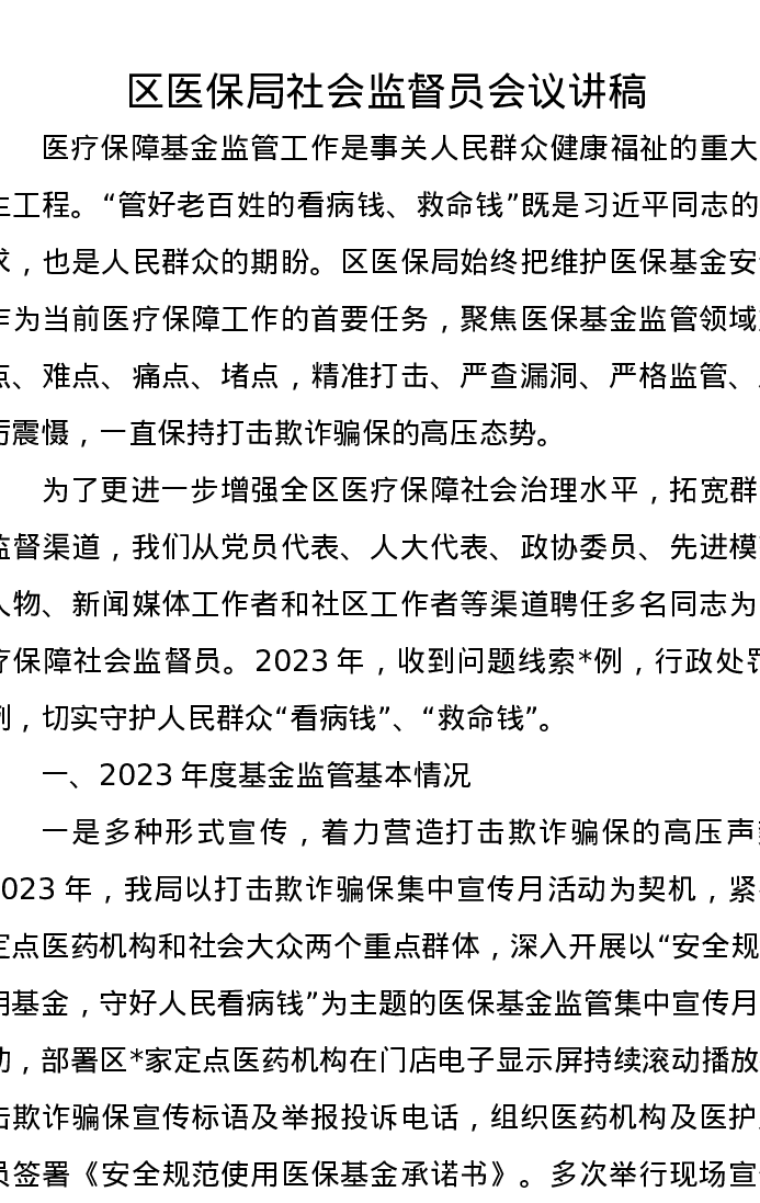 区医保局社会监督员会议讲稿