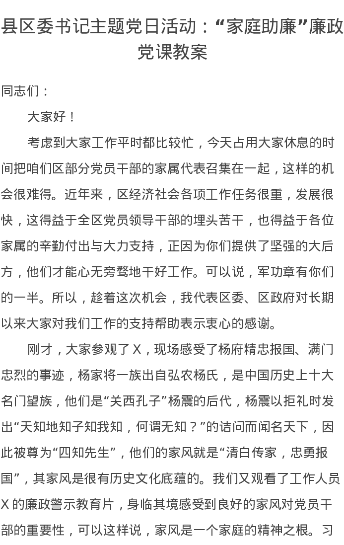 县区委书记主题党日活动:“家庭助廉”廉政党课讲稿