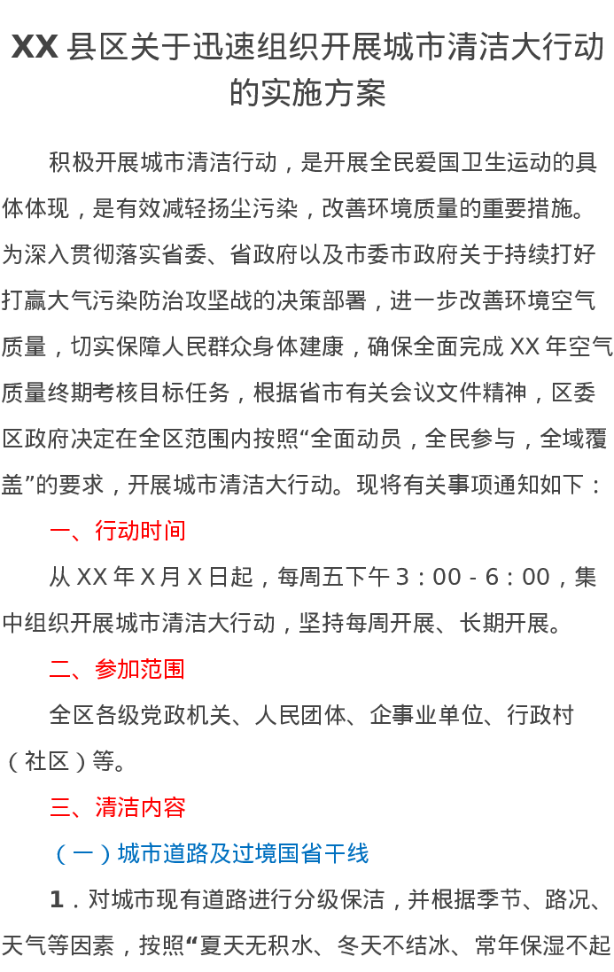 XX县区关于迅速组织开展城市清洁大行动的实施方案