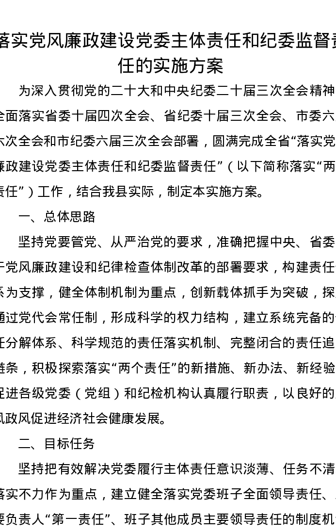 落实党风廉政建设党委主体责任和纪委监督责任的实施方案