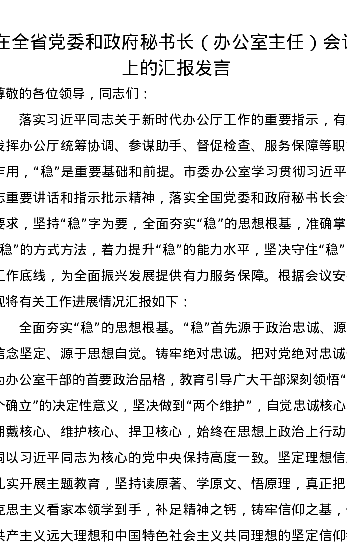 在全省党委和政府秘书长(办公室主任)会议上的汇报发言