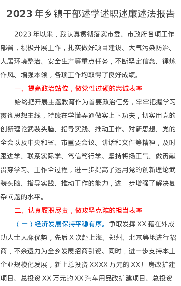 2023年乡镇干部述学述职述廉述法报告