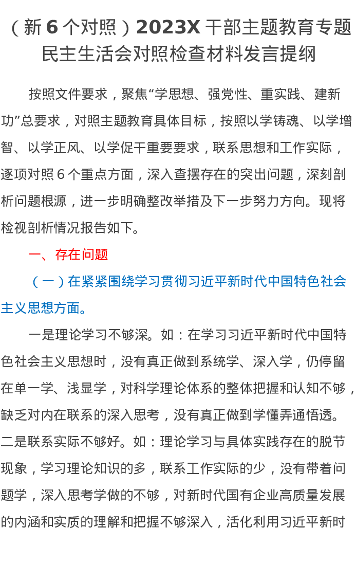 (新6个对照)2023X干部第二批主题教育专题民主生活会对照检查材料发言提纲(特色社会主义思想)