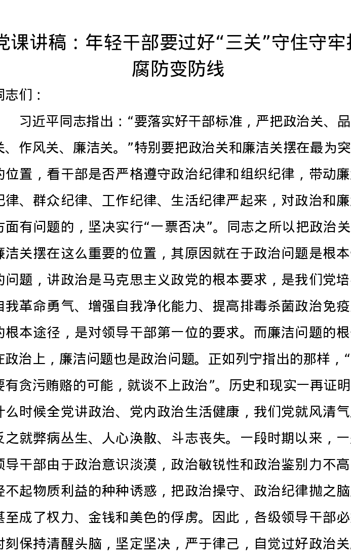 党课讲稿:年轻干部要过好“三关”守住守牢拒腐防变防线