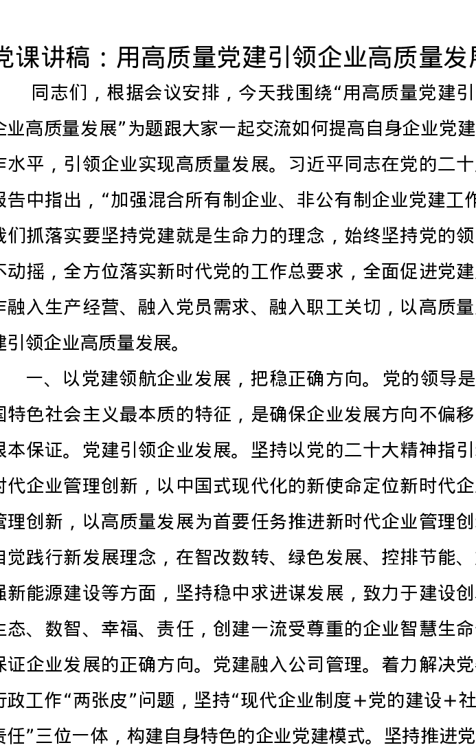 党课讲稿:用高质量党建引领企业高质量发展