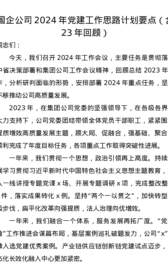 国企公司2024年党建工作思路计划要点(含23年回顾)