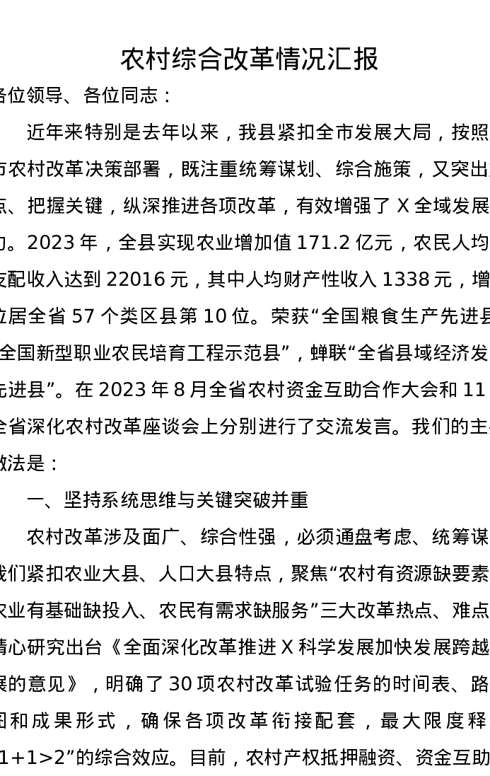 农村综合改革情况汇报