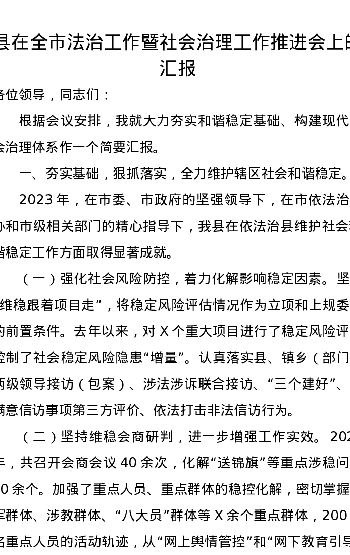 县在全市法治工作暨社会治理工作推进会上的汇报