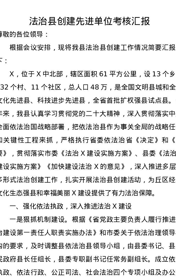 法治县创建先进单位考核汇报