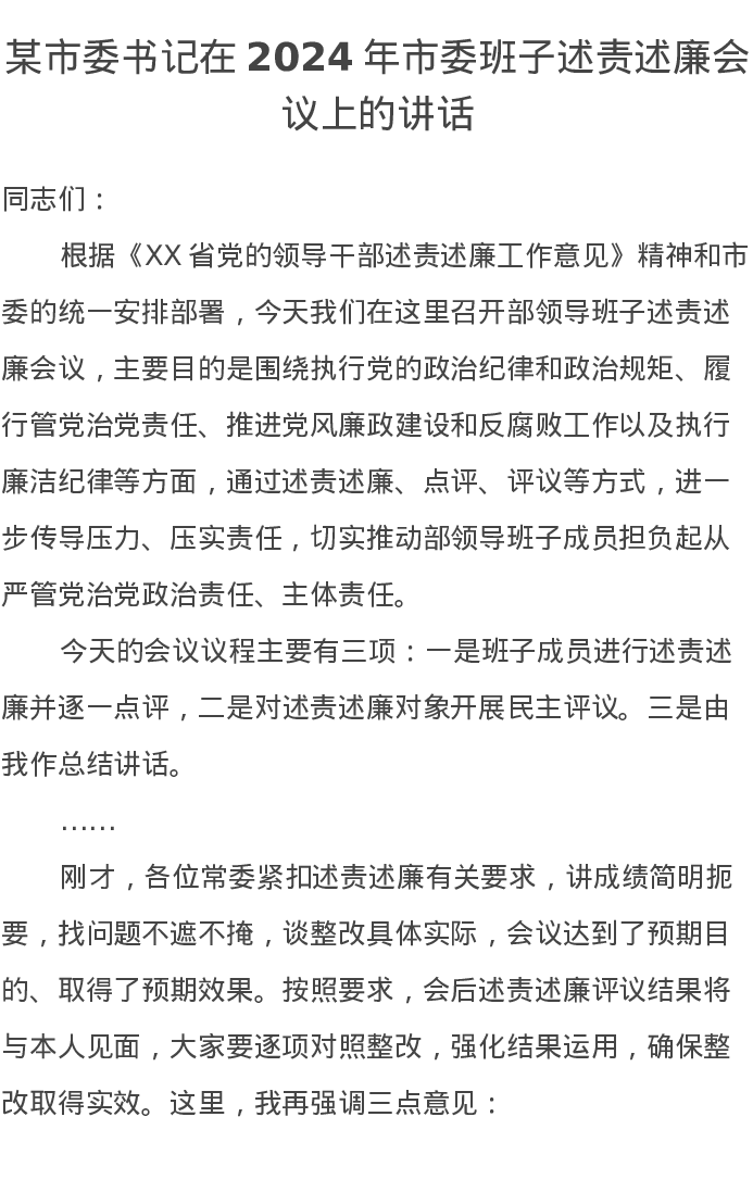 某市委书记在2024年市委班子述责述廉会议上的讲话