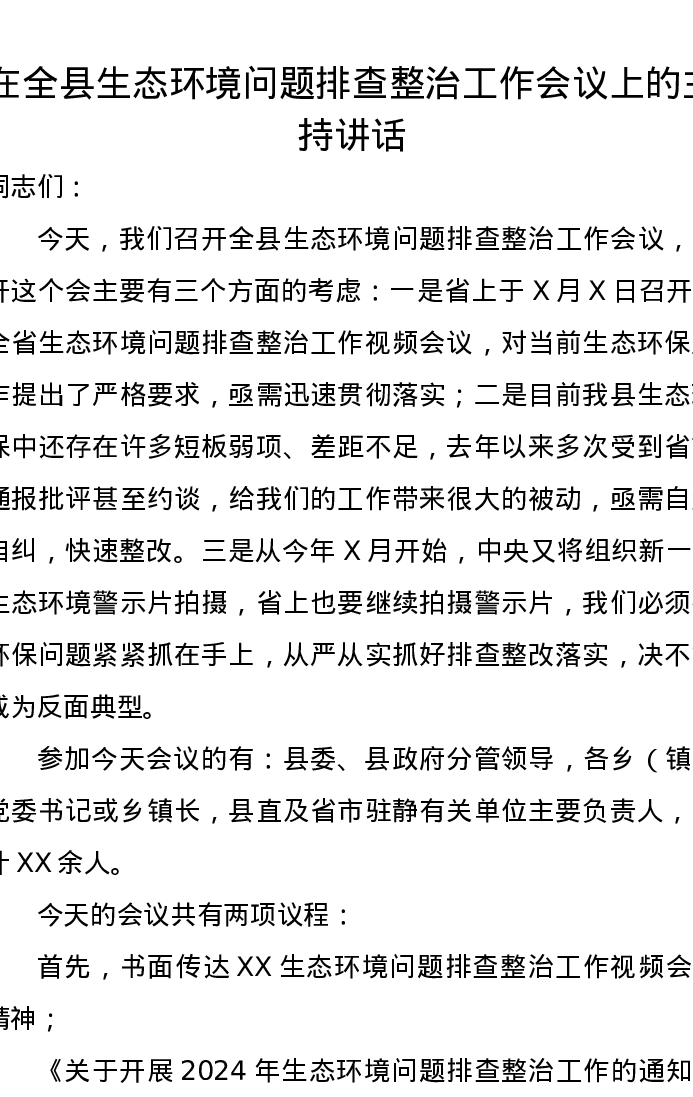 在全县生态环境问题排查整治工作会议上的主持讲话