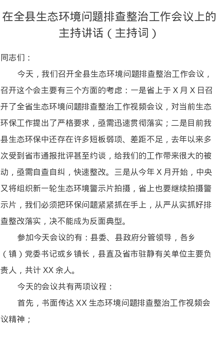 在全县生态环境问题排查整治工作会议上的主持讲话(主持词)