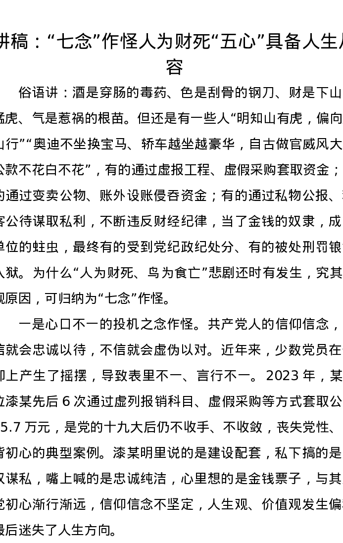 党课讲稿:“七念”作怪人为财死“五心”具备人生从容