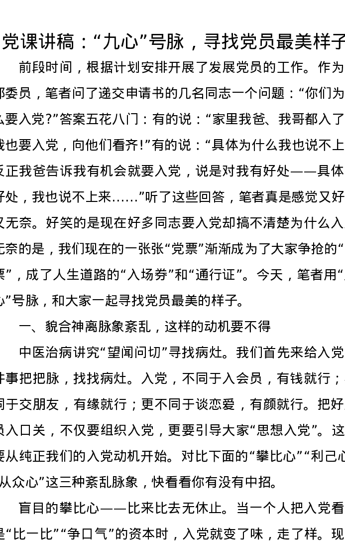 党课讲稿:“九心”号脉,寻找党员最美样子