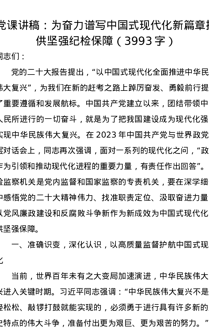 党课讲稿:为奋力谱写中国式现代化新篇章提供坚强纪检保障