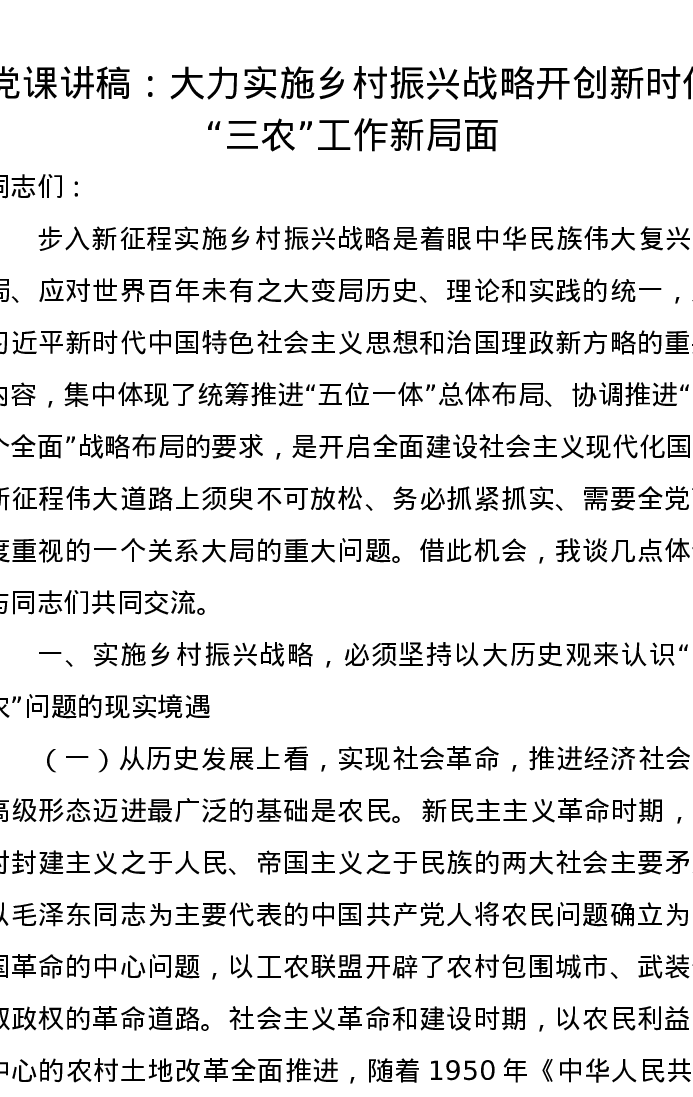 党课讲稿:大力实施乡村振兴战略开创新时代“三农”工作新局面