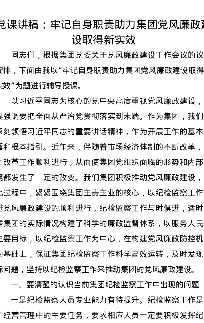 党课讲稿:牢记自身职责助力集团党风廉政建设取得新实效