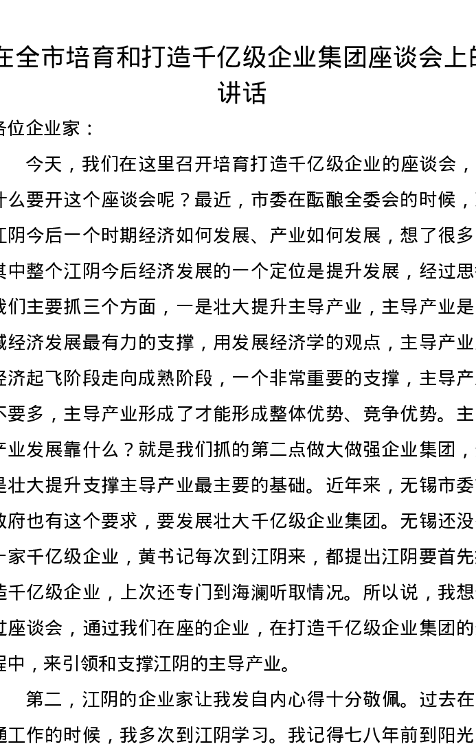 优选讲话:在全市培育和打造千亿级企业集团座谈会上的讲话