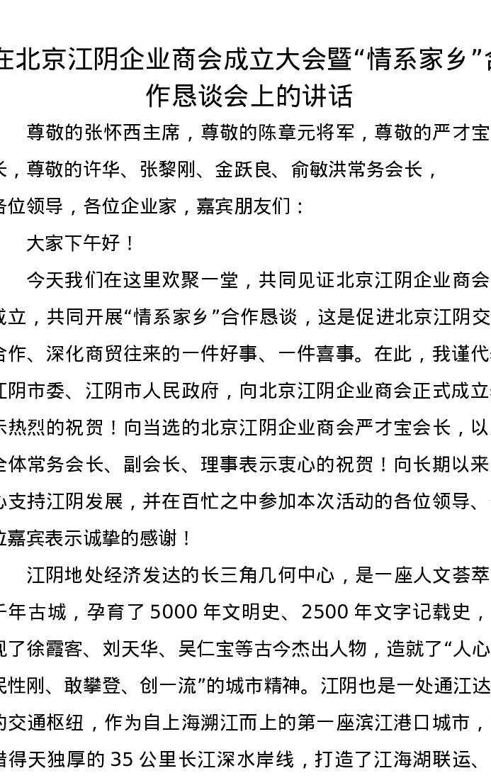 优选讲话:在北京江阴企业商会成立大会暨“情系家乡”合作恳谈会上的讲话