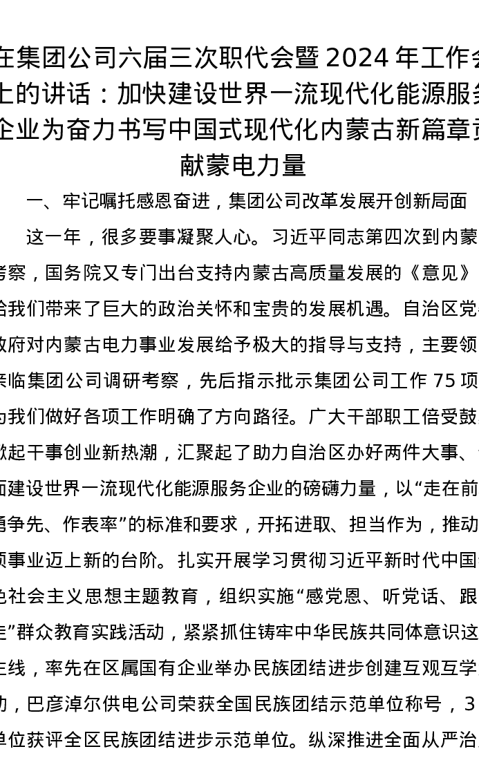 优选讲话:在集团公司六届三次职代会暨2024年工作会上的讲话:加快建设世界一流现代化能源服务企业为奋力书写中国式现代化内蒙古新篇章贡献蒙电力量