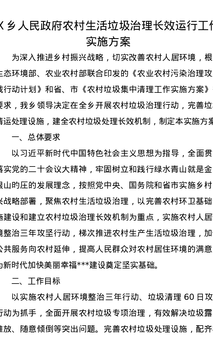X乡人民政府农村生活垃圾治理长效运行工作实施方案