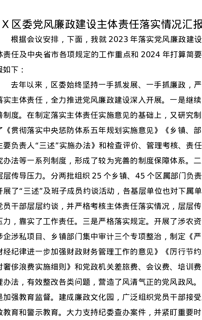 X区委党风廉政建设主体责任落实情况汇报